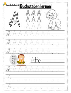 Anschließend wird der Buchstabe oder die Zahl anhand von Punkten nachgezeichnet. Das Nachschreiben fördert den Lernfortschritt und die Punkte verschwinden immer mehr, sodass die Bewegung im Gedächtnis bleibt. Anschließend kann das Kind zusammen mit dem Elternteil die Wörter aus dem Grundwortschatz lesen, um die dazugehörige Aussprache üben.