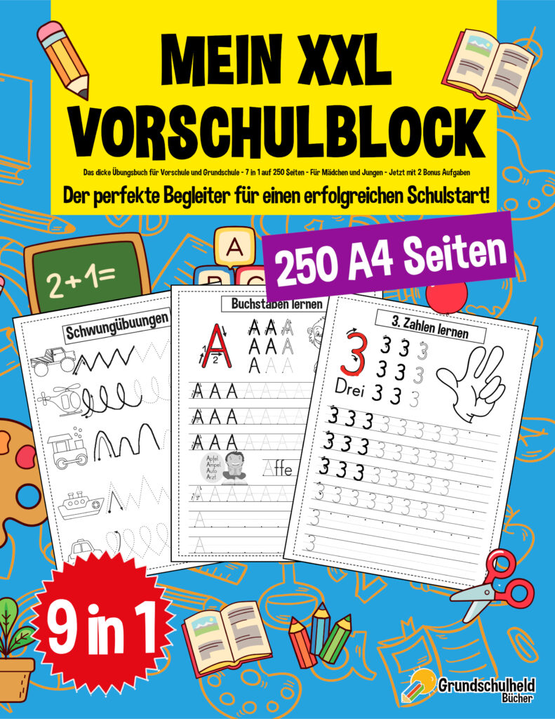 Ihnen liegt die Entwicklung Ihres Kindes am Herzen? Sie möchten, dass ihr Kind spielend leicht und mit viel Freude das Schreiben lernt? Dann sind Sie hier genau richtig! Fördern Sie ihr Kind mit diesem DINA4 großen, innovativen 250 DinA4 XXL Übungsheft damit es kinderleicht das Schreiben lernt und erleben Sie gemeinsam die Lernfortschritte.
